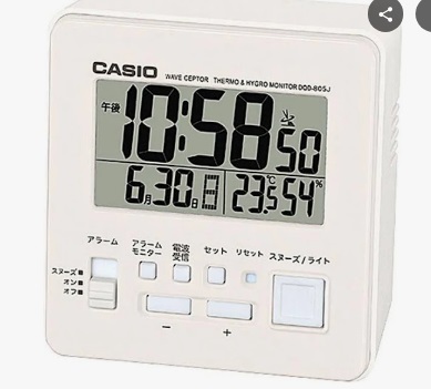 - 湿度が分かる時計。空気が乾燥していると私も感染するかもしれないので、湿度をまめにチェックします。商品名「カシオ – DQD-805J-2JF 電波目覚まし時計」です。